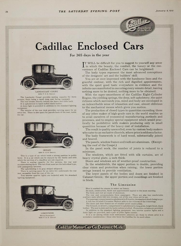 This is an original 1915 black and white print advertisement for Cadillac Enclosed Cars from the Cadillac Motor Car Company of Detroit. Illustrated here are: the Cadillac Landaulet ($2500); the Cadillac Sedan ($2800); and the Cadillac 7-Passenger Limousine ($3450). This is an excellent original print item for the collector of antique Cadillacs!