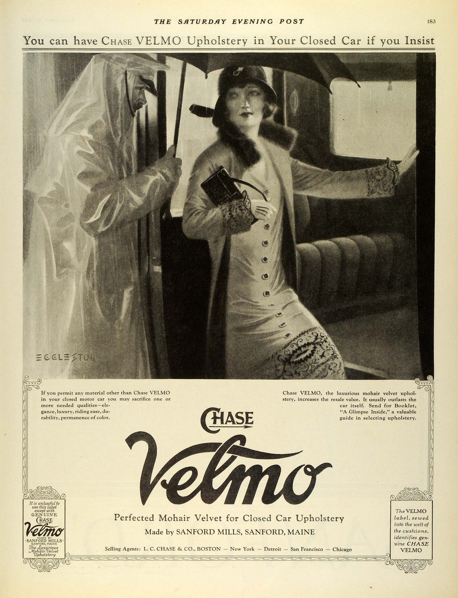 This is an original 1925 black and white print ad for Chase Velmo perfected mohair velvet for closed car upholstery made by Sanford Mills of Sanford, Maine. L. C. Chase & Company are the selling agents of Boston.