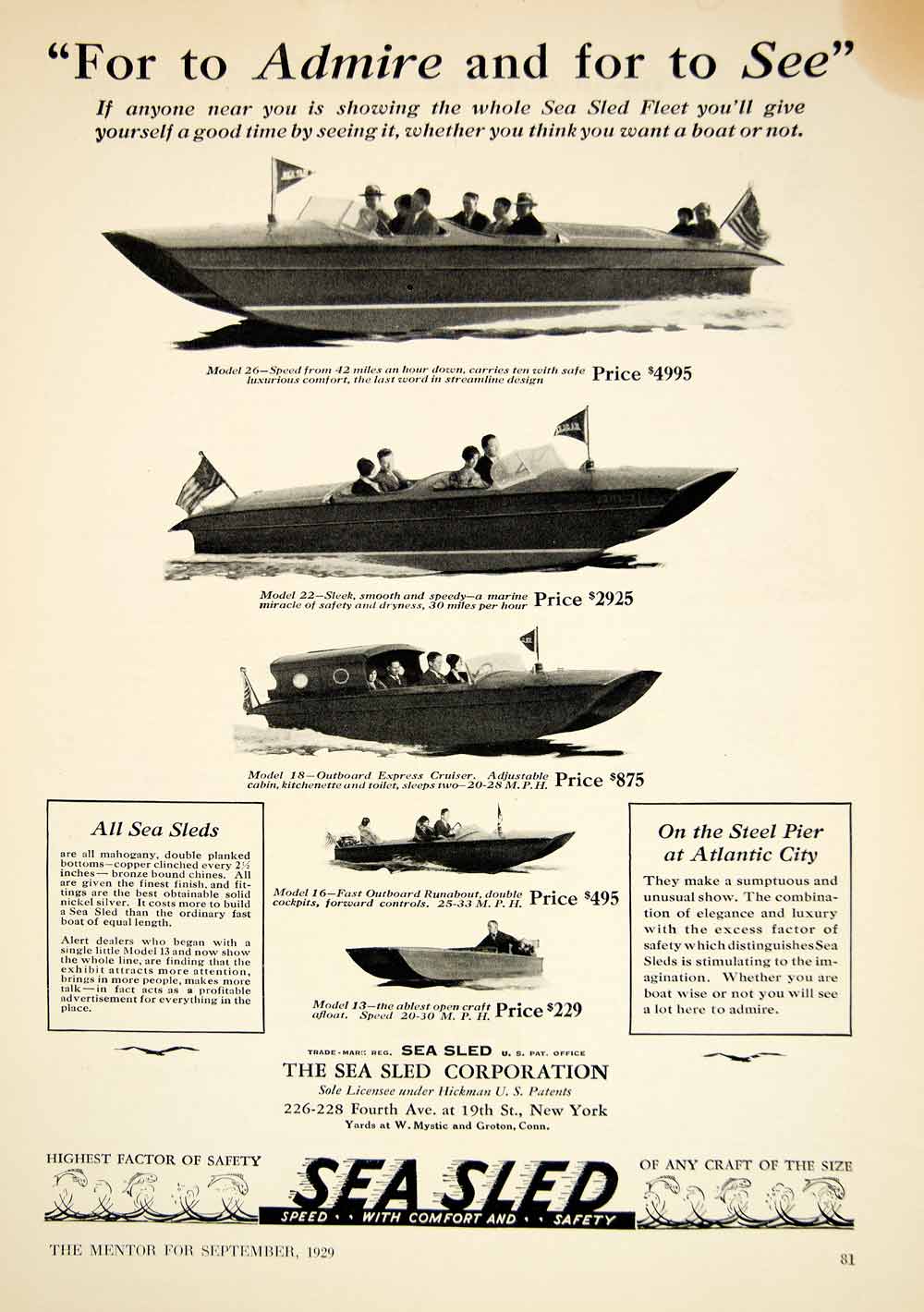 This is an original 1929 black and white print ad for boats from The Sea Sled Corporation, 226-228 Fourth Ave. at 19th Street, NYC. The models shown here are: the Model 26, Model 22, Model 18, Model 16, and Model 13 –with prices.